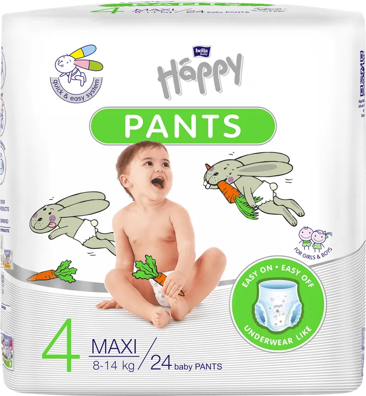 Bella Baby Happy Pants Maxi sú navrhnuté s dôrazom na maximálne pohodlie a bezpečnosť dieťaťa, ktoré sa učí samostatnosti. Systém Quick & Easy zabezpečuje rýchlu a jednoduchú výmenu plienky, vďaka čomu sa dieťa môže bez zbytočného zdržania vrátiť k ďalšiemu objavovaniu sveta.